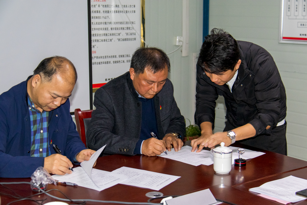 为进一步加强基层党组织建设,发挥党支部战斗堡垒和党员先锋模范作用,努力构建杭州市建设行业系统党建工作新格局,推动全市建设行业系统“百个支部结对百个工地”工作落地见效,2019年11月25日上午,中共杭州市建筑业管理服务站第二党支部委员会与中共艮山路(沪杭甬高速—明月桥路)地下综合管廊工程临时党支部委员会,在位于杭州市江干区五堡云峰社区的建设工地项目部党员活动室签订了结对共建协议。杭州市建筑业管理服务站第二党支部一行8人、艮山路(沪杭甬高速—明月桥路)地下综合管廊工程临时党支部全体党员、杭州九体育·官方站官网集团副总裁、集团总经理、副总经理、集团工程部经理、项目经理、项目技术负责人等人以及建设单位、监理单位相关负责人代表共同见证了这一时刻。