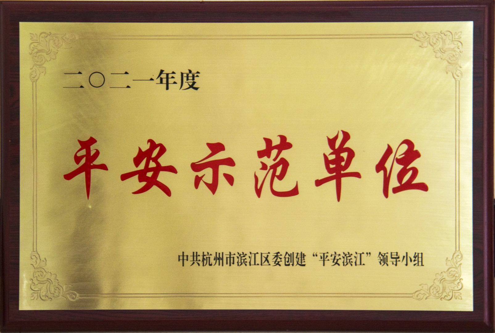 近日,公司被中共杭州市滨江区委创建“平安滨江”领导小组授予2021年度滨江区“平安示范单位”称号。