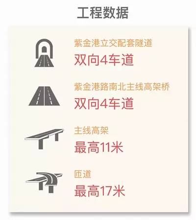 紫金港立交文一路东西主线为地下双向4车道隧道,紫金港路南北主线为双向4车道高架桥,高架主线最高的部分达到11米,匝道最高有17.3米。根据计划,在G20峰会之前,紫金港立交将实现南北线高架通车的目标。